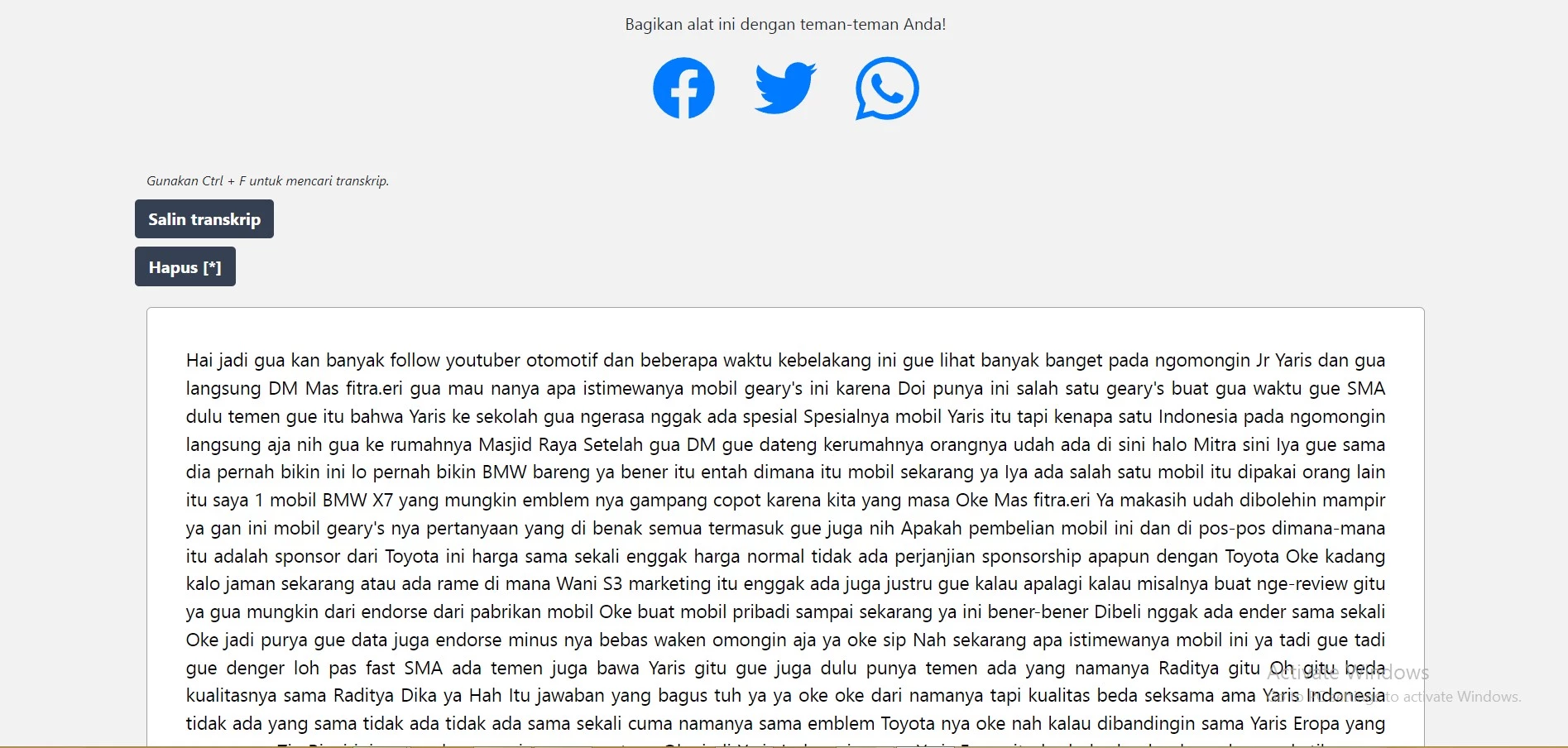 5). Menunggu beberapa saat sampai toolsnya selesai mengerjakan transkrip videonya. Hasilnya bakal langsung muncul di bagian bawah.